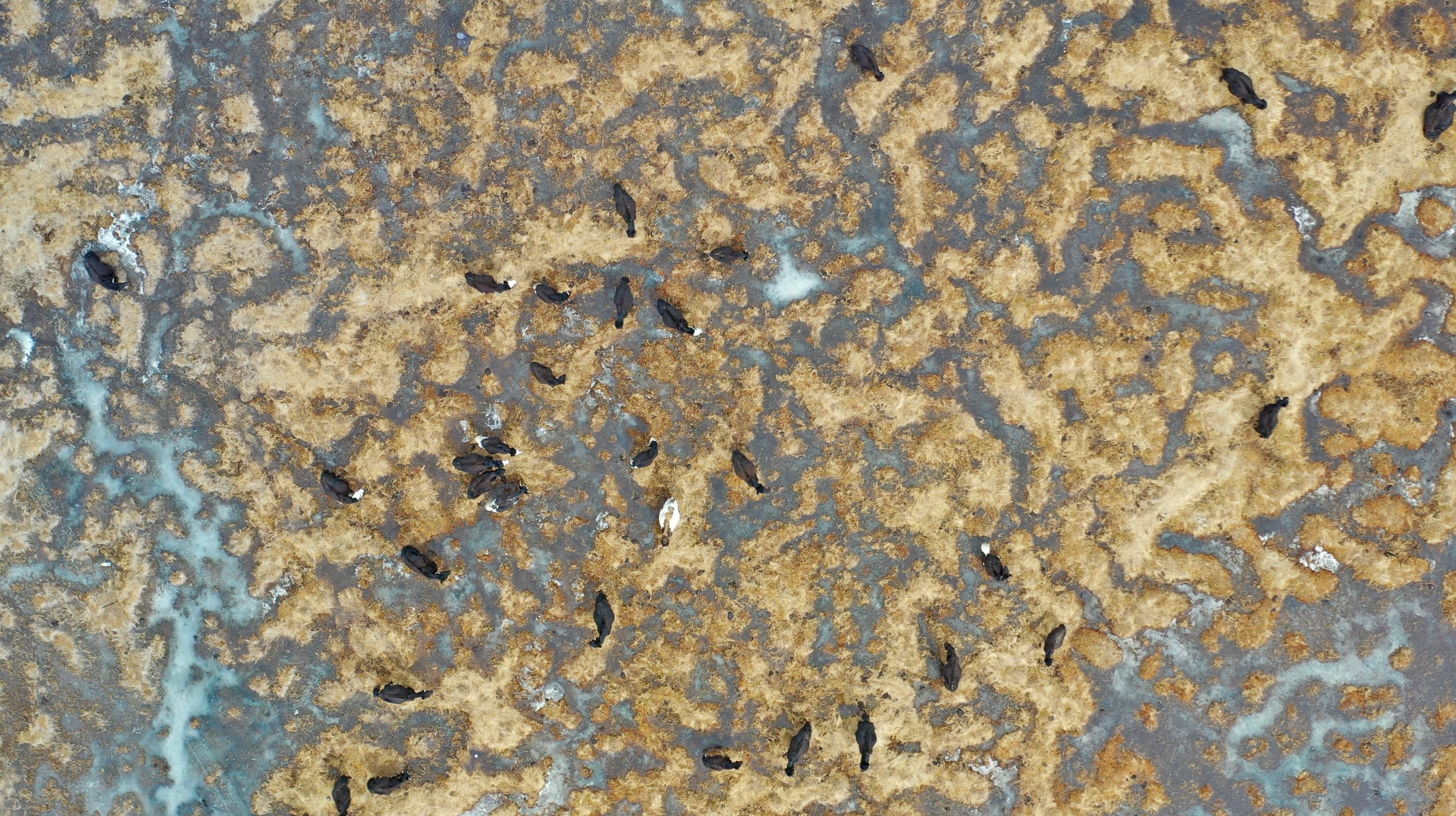 Yaks in wetland pasture, February 2024, Aerial footage by Mingxin Li
